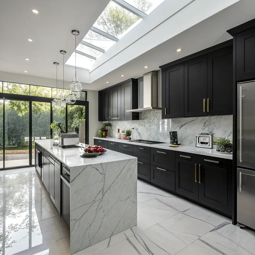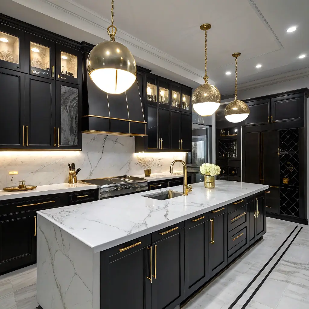 Want to feel like you’re living in a penthouse every time you make coffee? High-gloss black cabinets paired with white marble countertops create that exact energy. The reflective surface of glossy cabinets bounces light around, preventing that cave-like feeling people worry about with black kitchens.