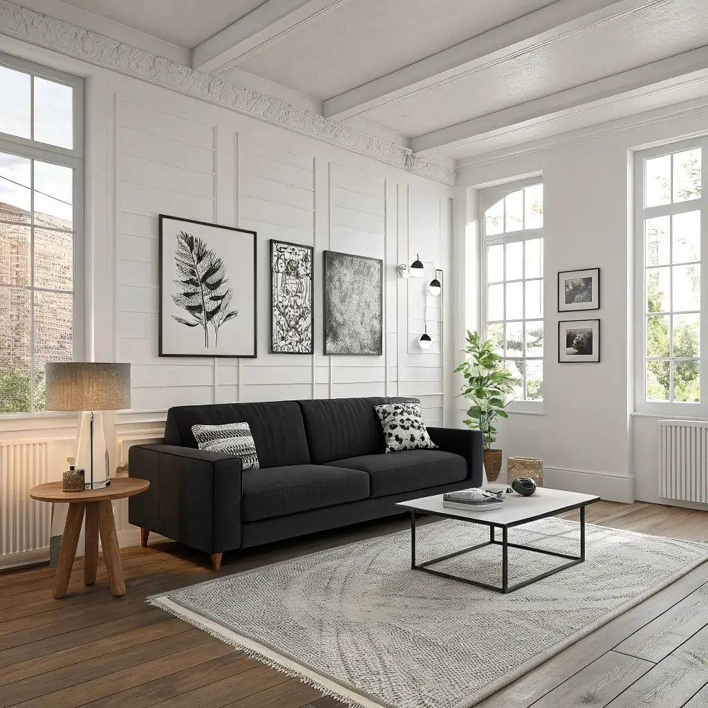 Start with your black sofa as the anchor piece. Then layer in charcoal gray curtains, maybe a dark gray area rug with subtle texture, and throw in some crisp white accents. The magic happens when you mix different textures – think smooth leather against chunky knit throws, or glossy black coffee tables next to matte black picture frames.