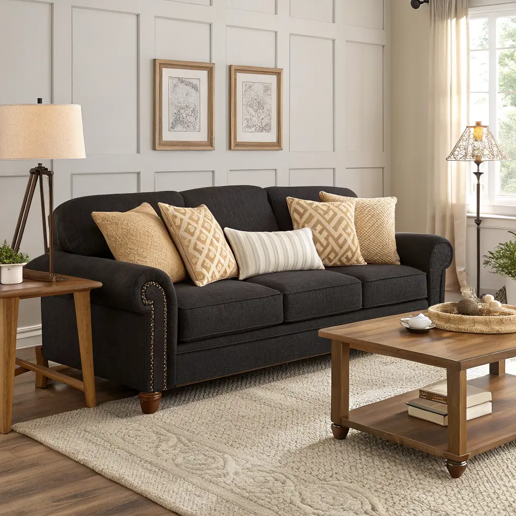 Cozy Black Sofa with Warm Neutral Accents