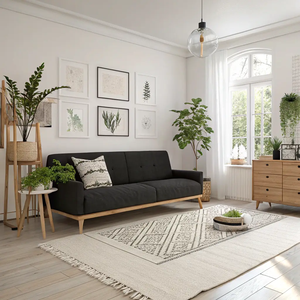 Keep everything else light and airy. White walls are non-negotiable here. Add blonde wood furniture – maybe a pale oak coffee table or birch side tables. The contrast between the dark sofa and light surroundings creates this amazing visual balance that feels both cozy and spacious.