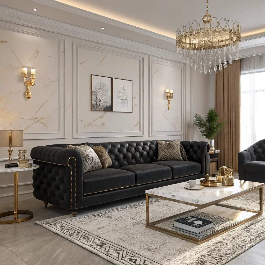 Elegant Black Sofa with Marble Decor