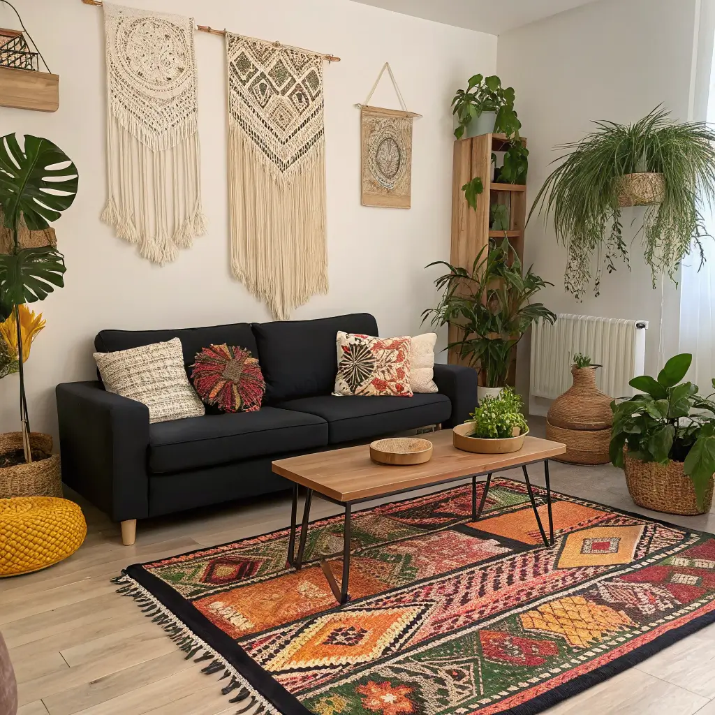 Throw a vintage Persian rug under your coffee table. Add a Moroccan pouf for extra seating. Pile on the patterned cushions – mixing prints is encouraged here! Macramé wall hangings, woven baskets, maybe some dried pampas grass in a corner. The black sofa grounds all this visual interest without competing for attention.