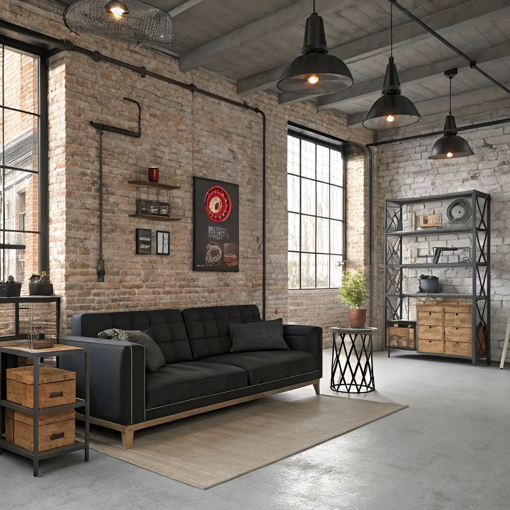 - Exposed elements (pipes, beams, brick)