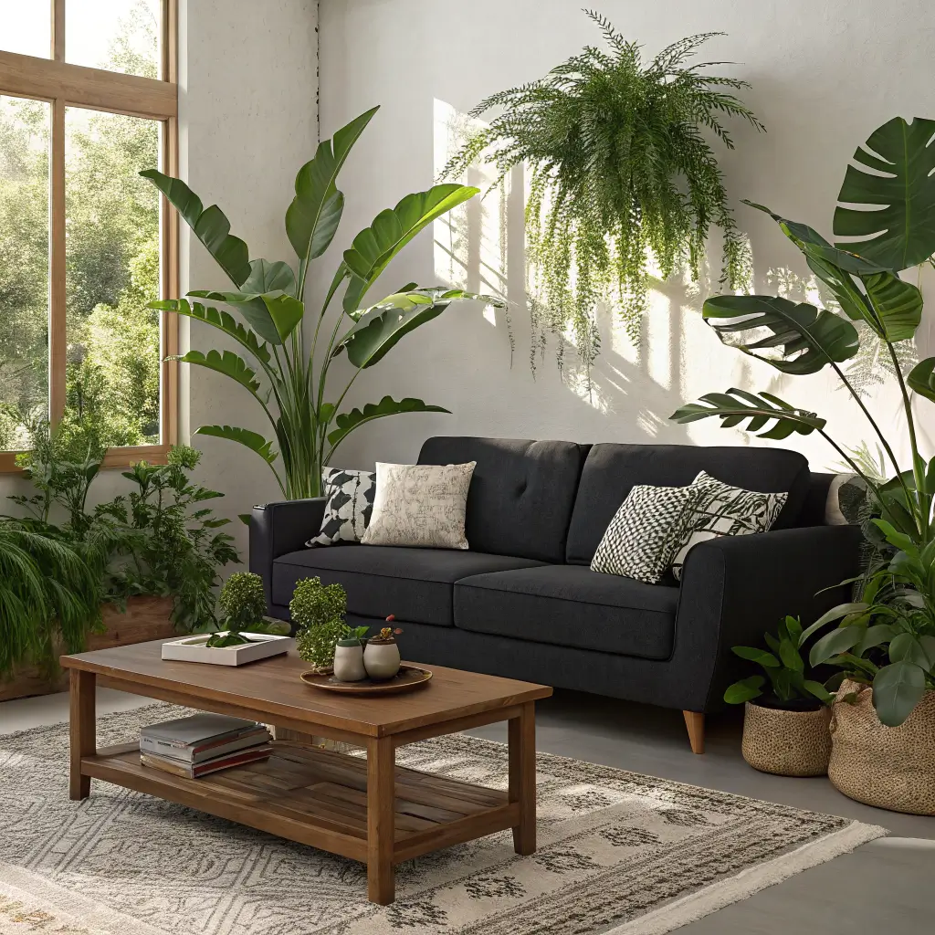 Black Sofa with Green Indoor Plants