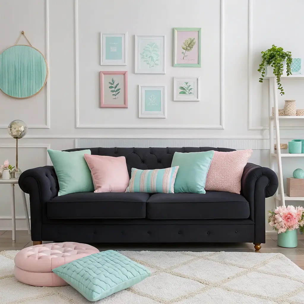 Black Sofa with Soft Pastel Accents