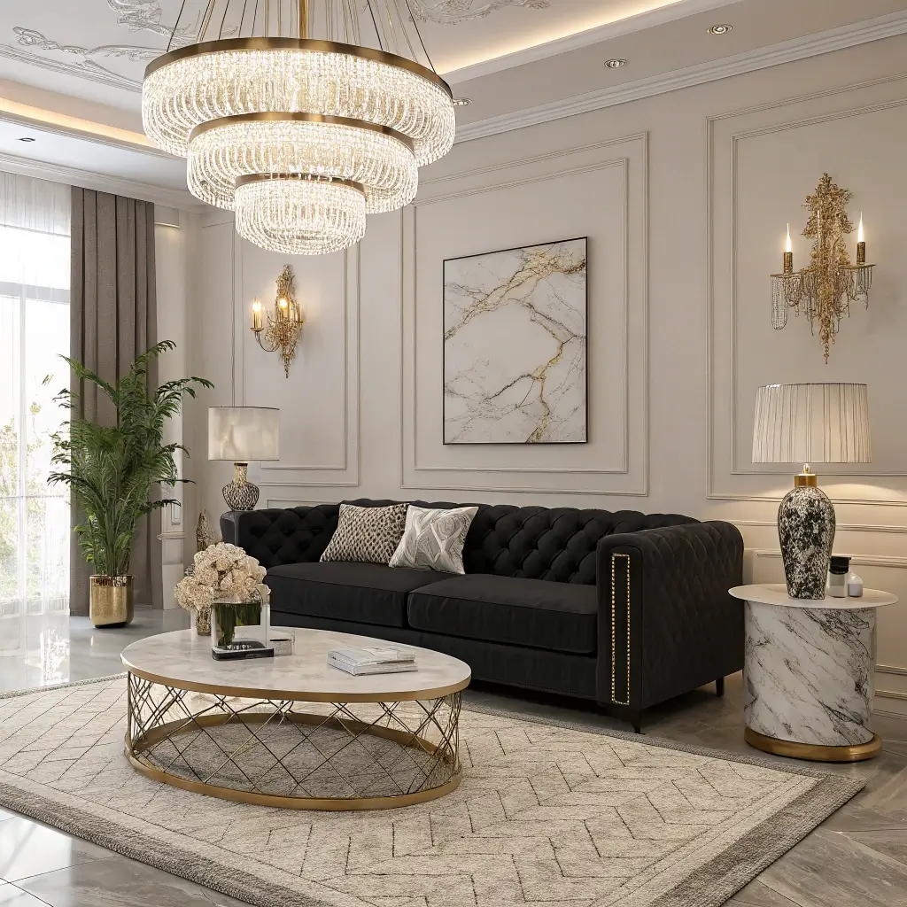 Want instant elegance? Pair your black sofa with marble accents. The combination of deep black and veined white marble creates this timeless, luxurious look that never goes out of style.