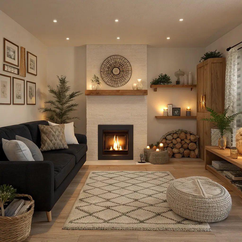 Black Sofa with Cozy Fireplace Setup
