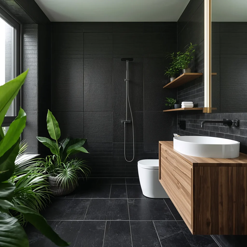 Here’s where things get interesting. Black tiles plus lush greenery equals instant spa vibes. The contrast between the dark, hard tiles and soft, living plants creates this amazing balance that just works.