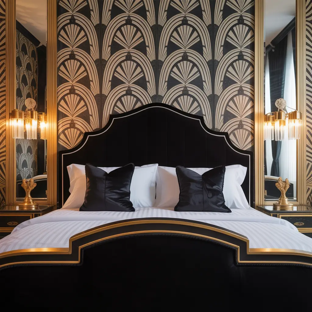 Start with geometric wallpaper featuring fan patterns or angular designs. Add furniture with clean lines but luxe details—think mirrored nightstands with gold trim or a tufted headboard with nail head details. The goal? Controlled opulence.