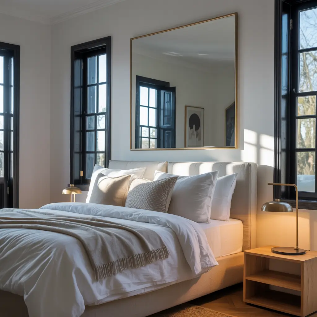 Gold mirrors become the jewelry of this look. Hang an oversized gold mirror as a focal point, or create a gallery wall with various sized mirrors in gold frames. They reflect light, making your room feel larger while adding that essential metallic warmth.