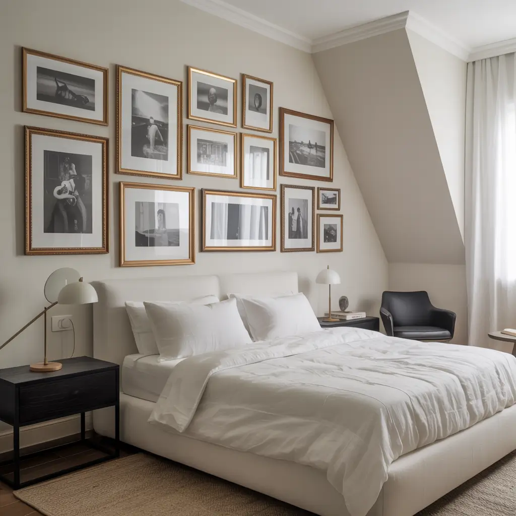 Vary your frame sizes but keep all frames gold for consistency. Mix ornate vintage frames with sleek modern ones—the gold finish ties them together despite different styles.