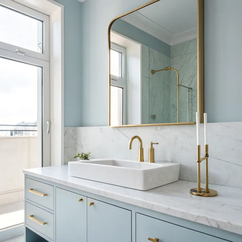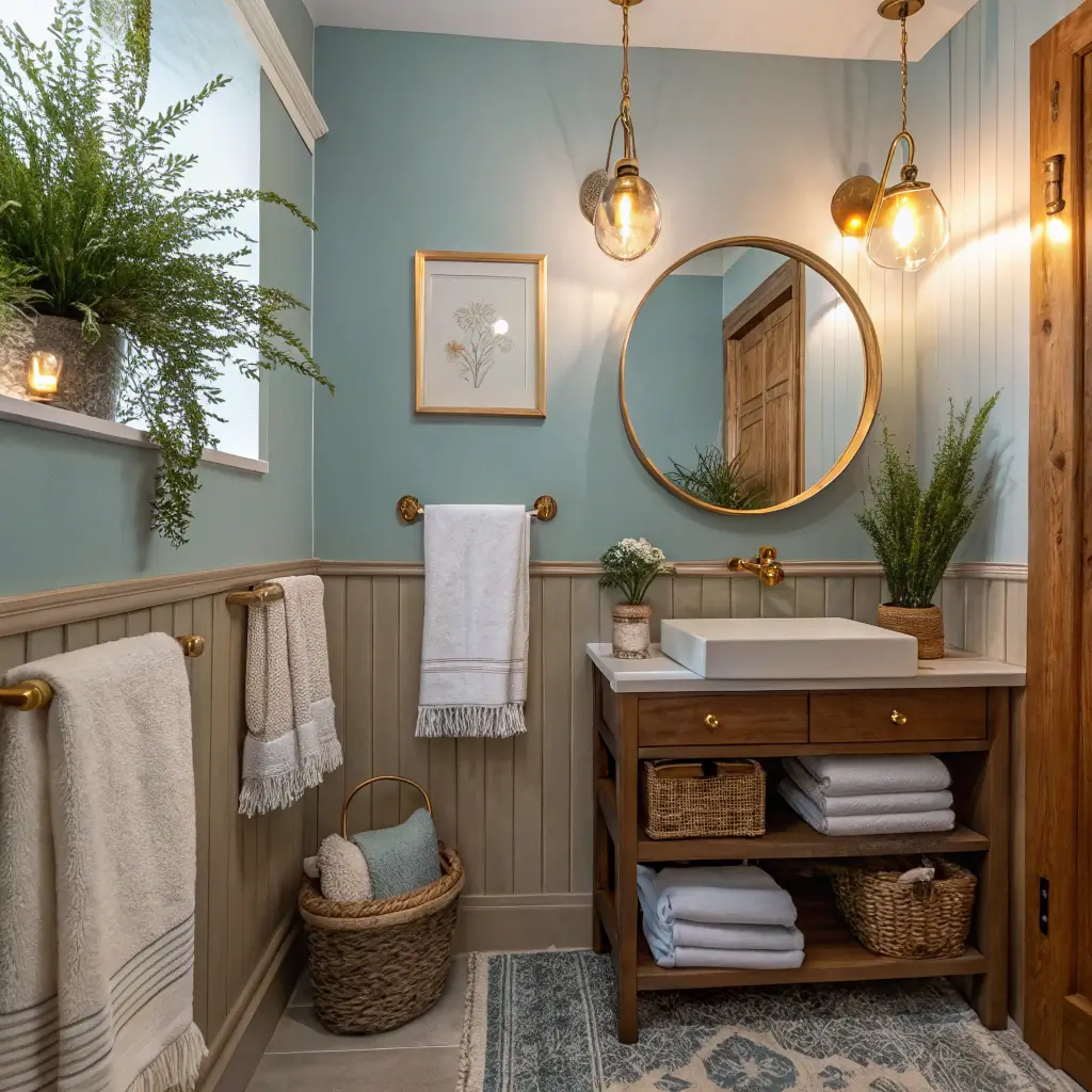 Here’s a trick that always works: paint your ceiling in a lighter shade of blue than your walls. This creates depth and makes the room feel taller. Add a small gold pendant light, and suddenly your tiny bathroom feels like a luxury hotel powder room.