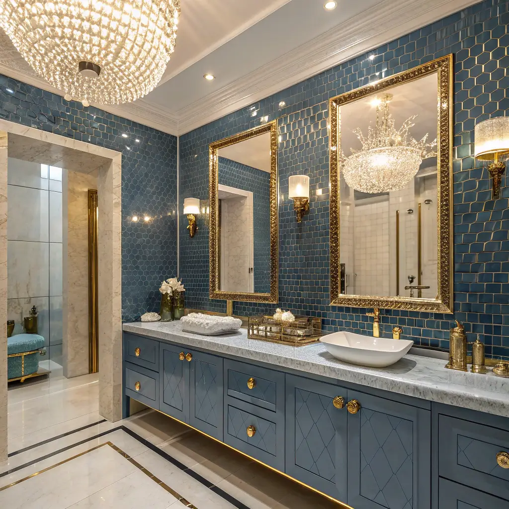 Picture this: iridescent blue tiles that shift from turquoise to sapphire depending on the angle, paired with polished gold fixtures that gleam like jewelry. Add crystal drawer pulls, a chandelier with gold accents, and mirrors with antiqued gold frames that catch every bit of light.