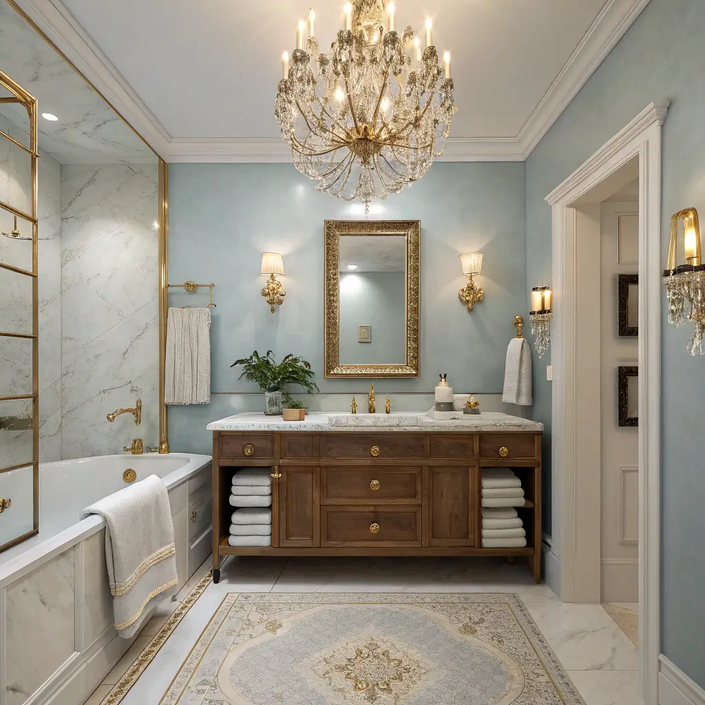 Think marble with blue veining and gold fixtures, crystal chandeliers with gold details, and silk curtains in pale blue. Elegance comes from quality materials and refined color choices. Navy blue paired with champagne gold creates a particularly sophisticated combination.
