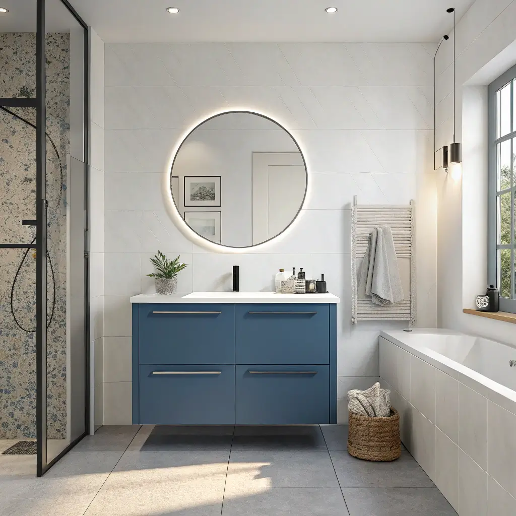 Add blue accessories in small doses – hand towels, soap dispensers, artwork. These items reinforce your color scheme without permanent commitment. Change them seasonally if you get bored easily.