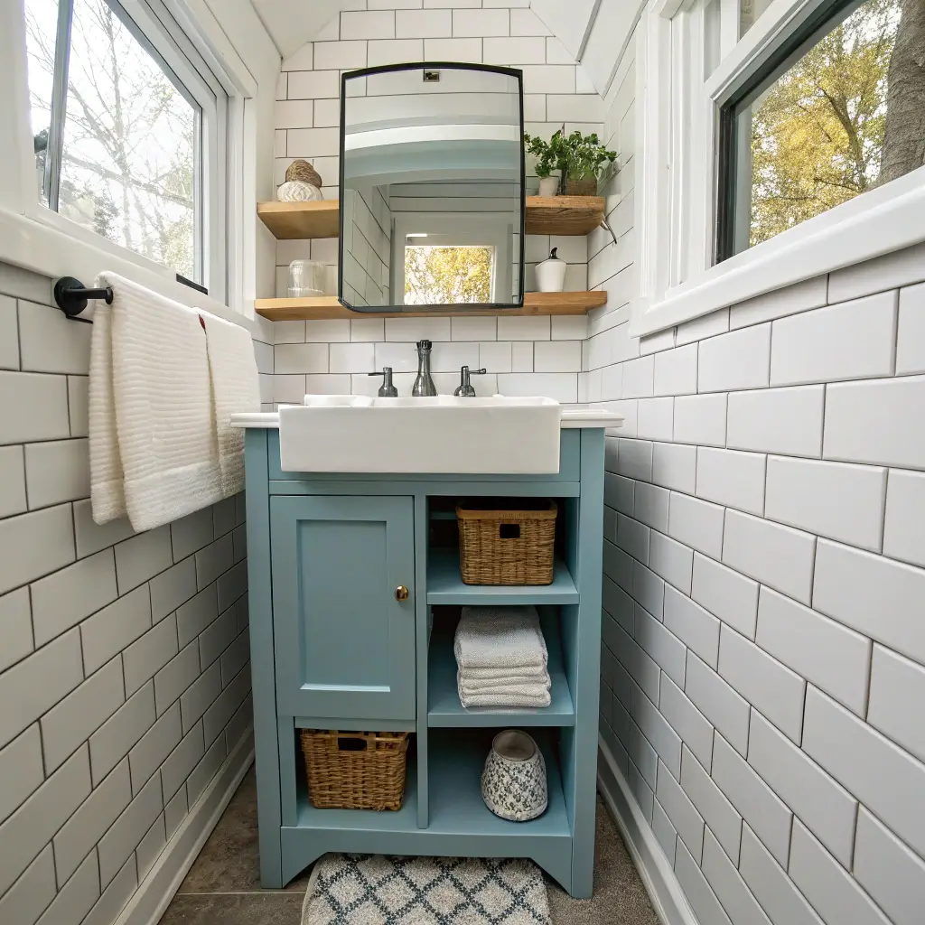 Minimalist doesn’t mean boring. It means every element serves a purpose and looks intentional. Your blue vanity becomes the focal point, not competing with seventeen different decorative elements.