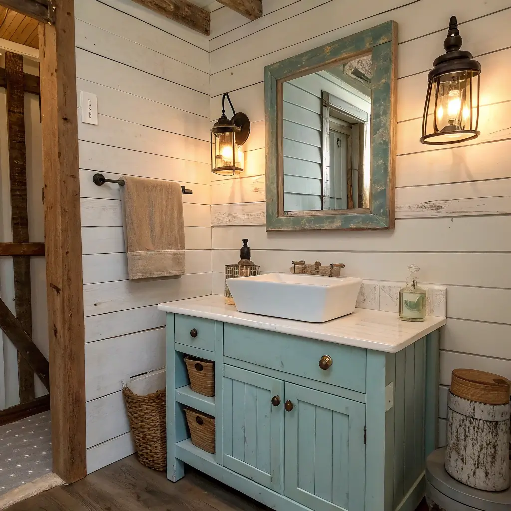 Add shiplap or beadboard behind your vanity as a backsplash. This texture adds instant farmhouse credibility. Paint it white for contrast or the same blue for a cohesive look.