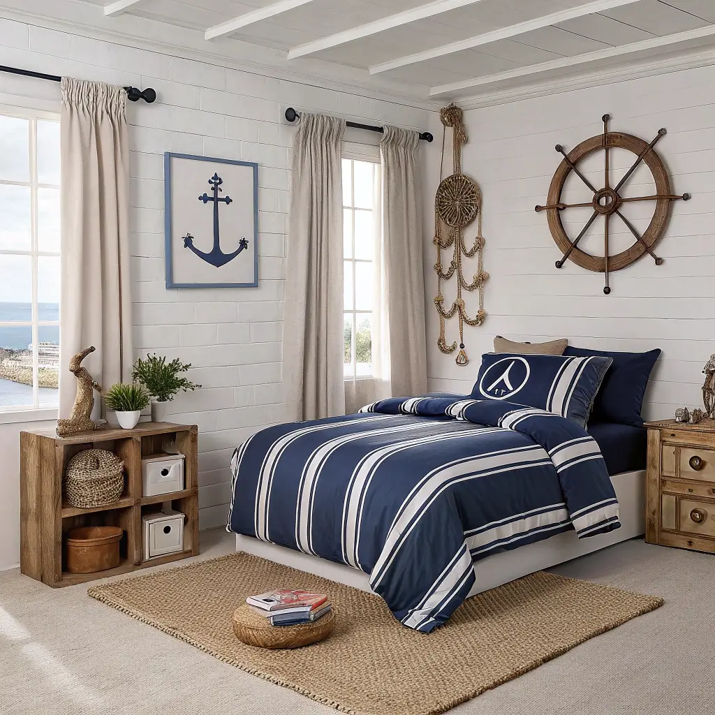 Navy blue and white stripes are your best friends here, but don’t go overboard (pun intended). Mix in some natural wood tones and rope accents to keep things from looking like a sailor suit exploded in the room.