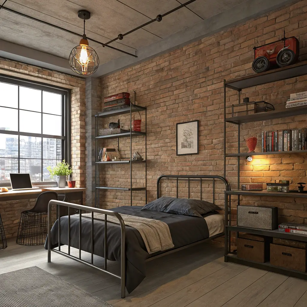 Exposed elements are key here – think metal bed frames, pipe shelving, and Edison bulb lighting. My teenager specifically requested this style, probably because it looks like something from his favorite video games.