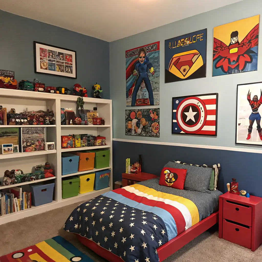 Skip the character-branded everything approach though. Comic book pages as wallpaper or framed vintage comics look way cooler and won’t date as quickly. Trust me, that Spider-Man bedding set gets old fast when the next movie introduces a new suit design.