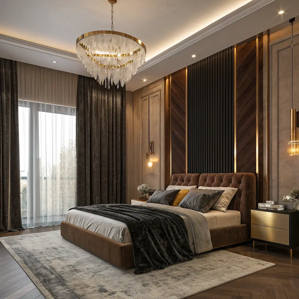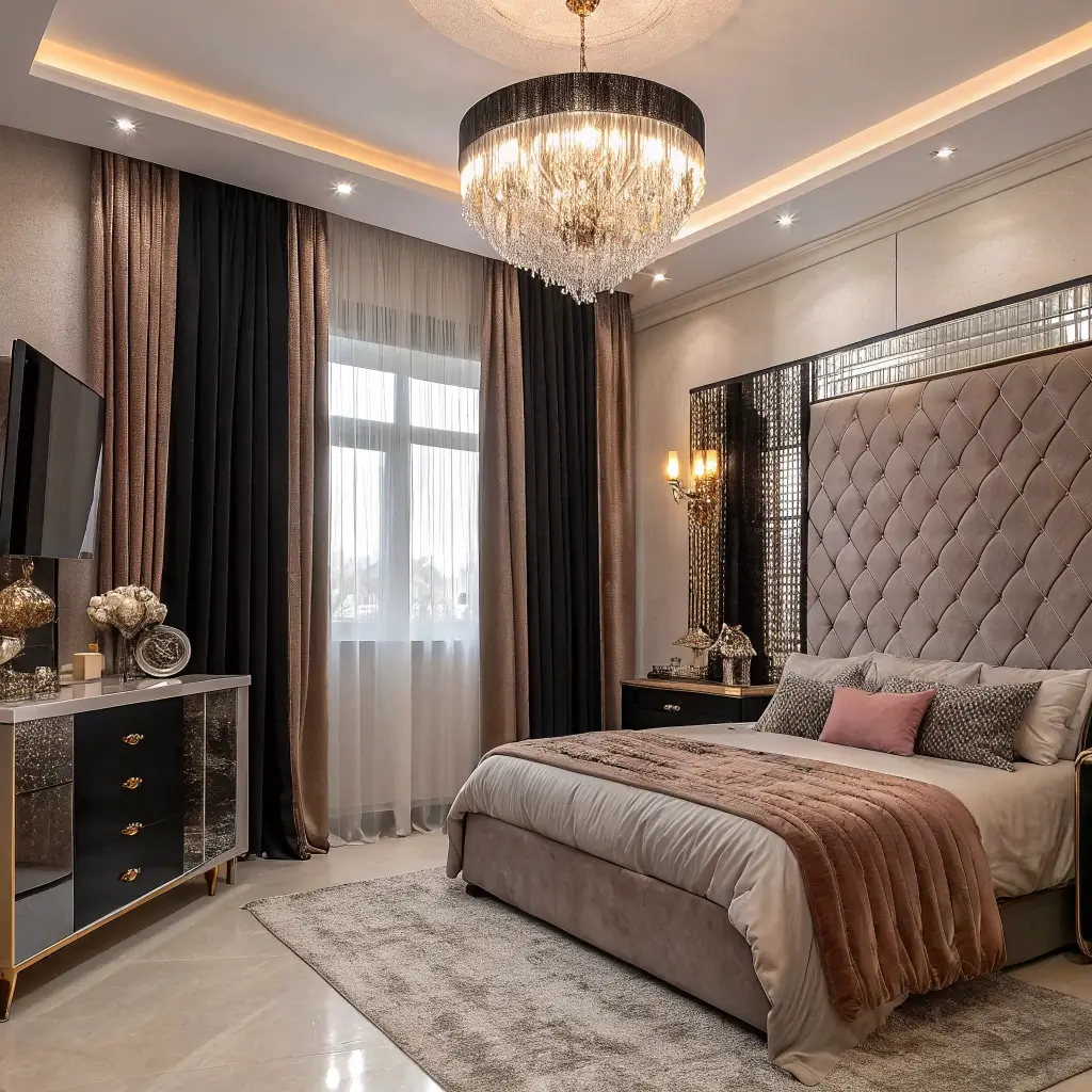 Ready to channel your inner Hollywood starlet? A glam bedroom is all about luxurious textures, sparkle, and drama—and sheer black and brown layers deliver on all three fronts.