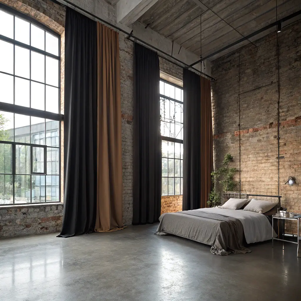 Black and brown curtains in an industrial space serve multiple purposes. They soften all that hard-edged architecture while maintaining the moody, urban aesthetic. Think of them as the bridge between raw and refined.