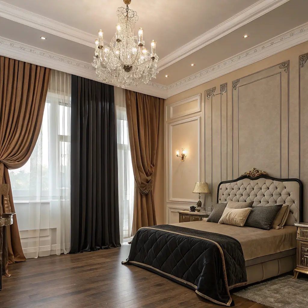 Layered Black and Brown Curtains for a Luxe Bedroom