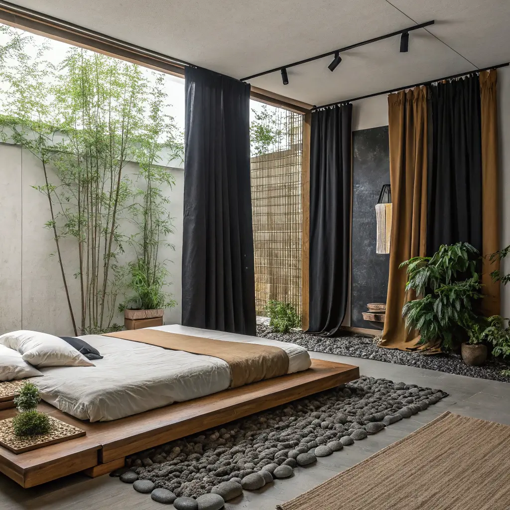 Zen-Inspired Bedroom with Earthy Dark Curtains