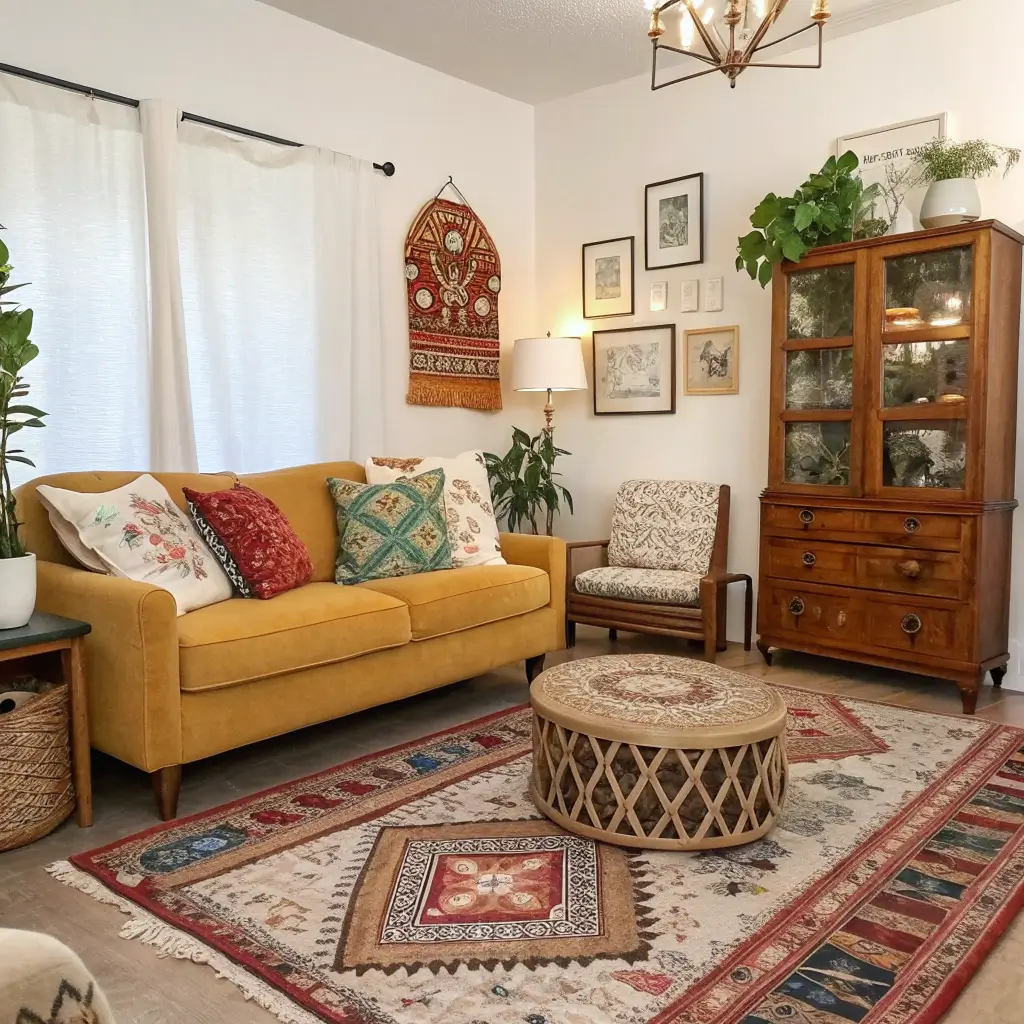 Vintage rugs from Facebook Marketplace layer beautifully over basic rugs from IKEA or Target. The worn spots that make them cheap? They add character when layered. Plus, layering means you can use smaller (cheaper) rugs to define different zones in open floor plans.