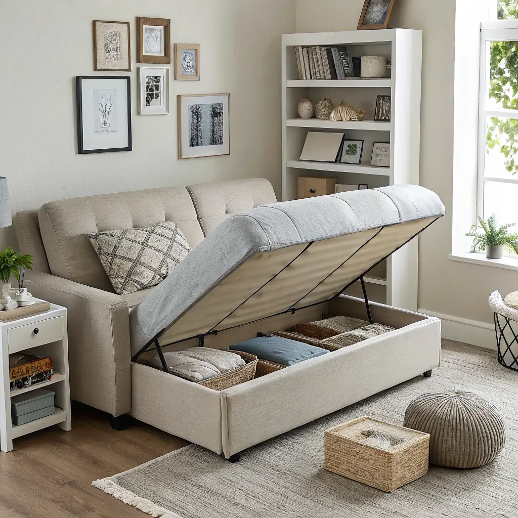 Here’s my favorite trick: hollow ottoman cubes and storage benches look like regular furniture but hide everything from shoes to seasonal decorations. Curtains hung below open shelving hide storage bins while maintaining that clean look. Even decorative ladders lean against walls and hold throws, magazines, or plants without taking up floor space.