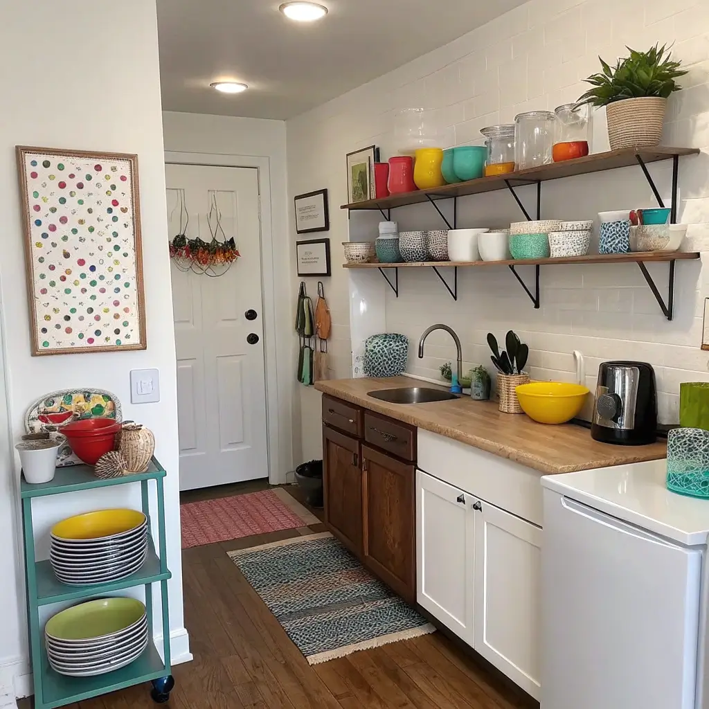Open shelving means your dishes become decor. Thrift stores have incredible vintage dishware for practically nothing. Display your prettiest pieces and hide the mismatched stuff. Wooden cutting boards leaning against the backsplash add warmth and hide ugly outlets.