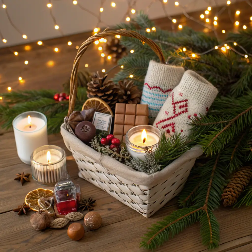 • Movie Night Basket: Popcorn, fancy hot chocolate mix, cozy socks, streaming gift card, retro candy