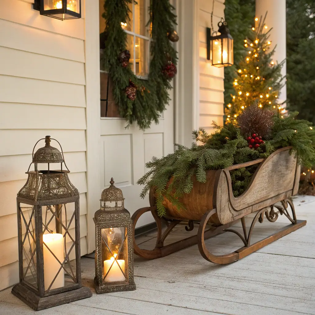 Position your sleigh at an angle near the door, filled with wrapped packages (empty boxes work fine), pine boughs, and vintage-style ornaments. Antique lanterns clustered around the base create a warm, inviting glow that modern decorations can’t replicate.