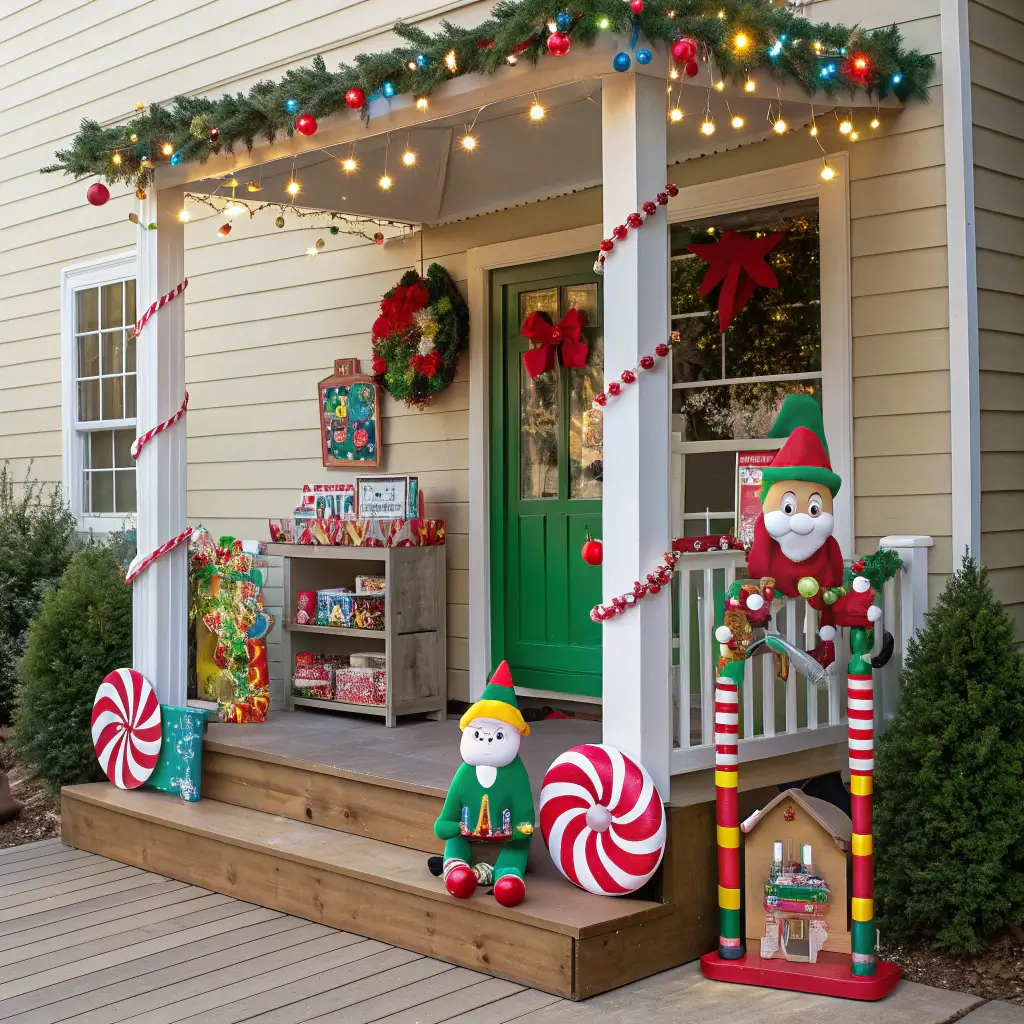 Transform your porch into Santa’s workshop annex with an elf theme that delights visitors of all ages. This theme lets you play with bright colors and fun elements while maintaining elegance through thoughtful execution.