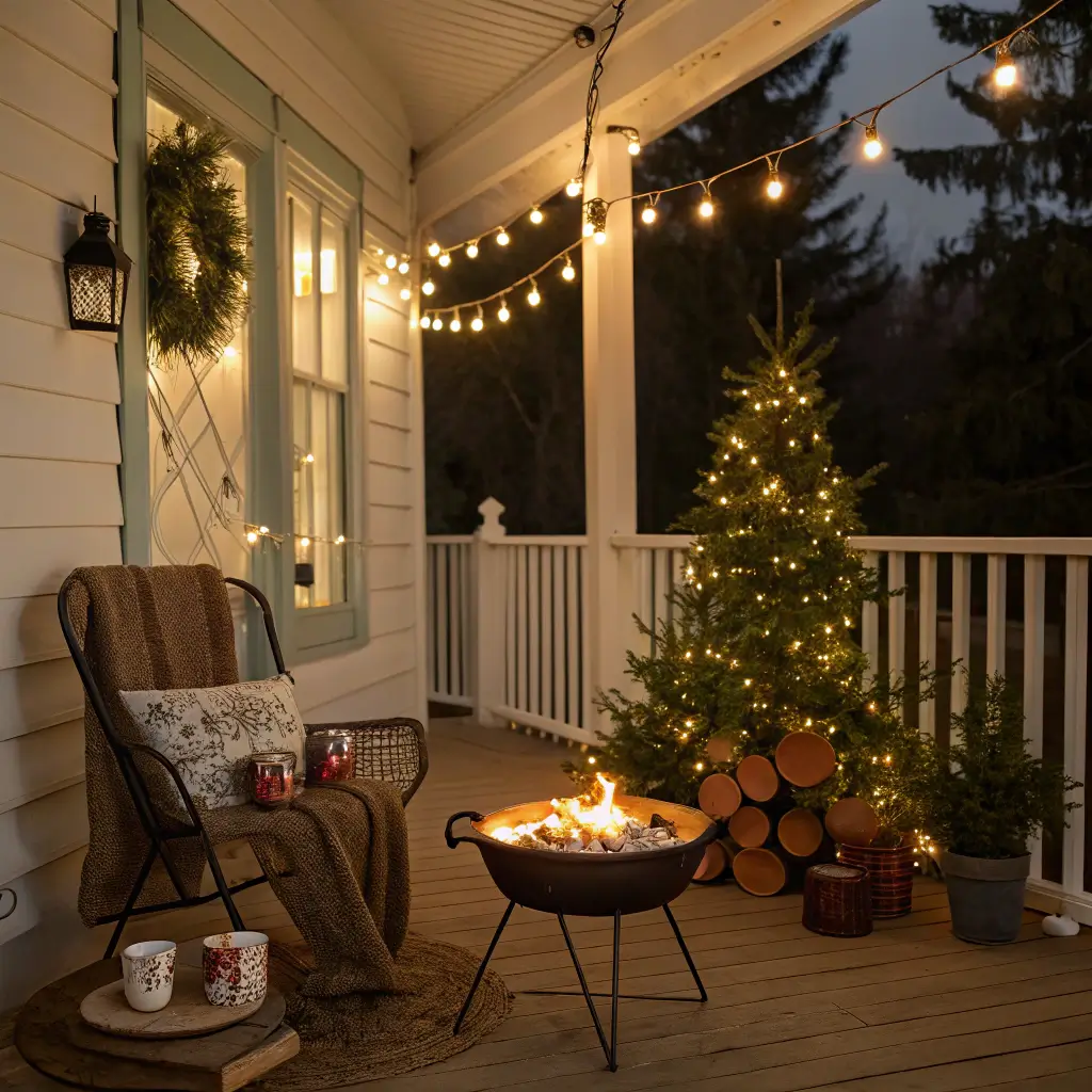 Position a tabletop fire pit as your centerpiece, surrounded by comfortable seating loaded with blankets. Set up a hot cocoa station on a vintage cart or side table. The goal? Creating an irresistible gathering spot.