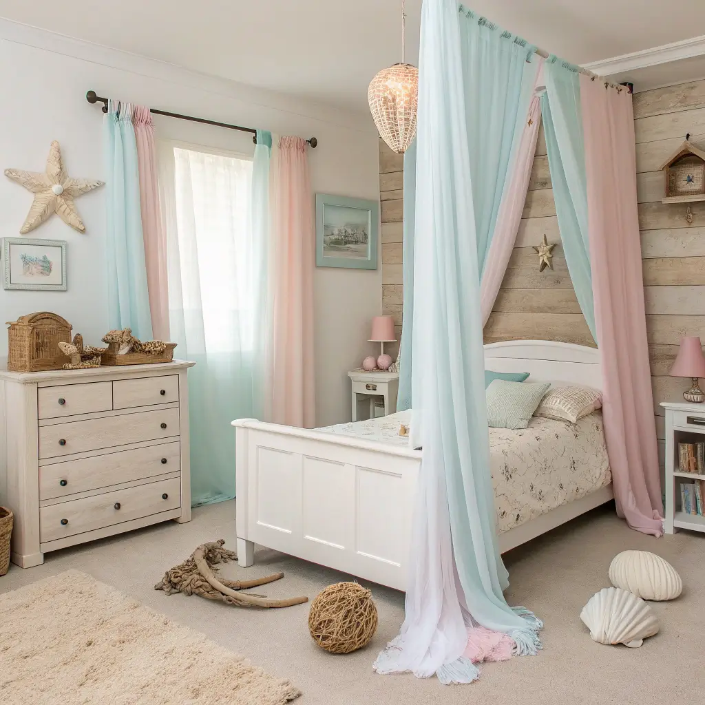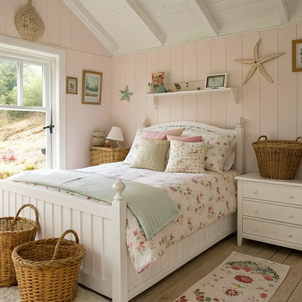 If you’re feeling bold, a single pastel accent wall can look stunning without overwhelming the space. Seafoam green or the palest blush make particularly beautiful backdrops for a coastal bedroom.
