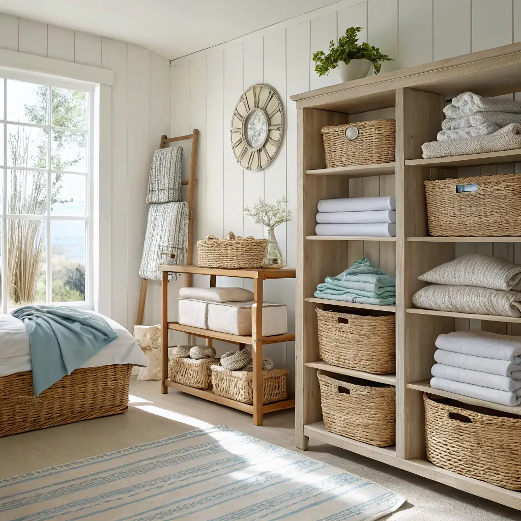 Here’s something people don’t talk about enough: coastal aesthetics require serious organization. Nothing kills that breezy, relaxed vibe faster than clutter. To maintain that light, airy feeling, you need smart storage solutions that keep mess hidden and your room looking effortlessly together.