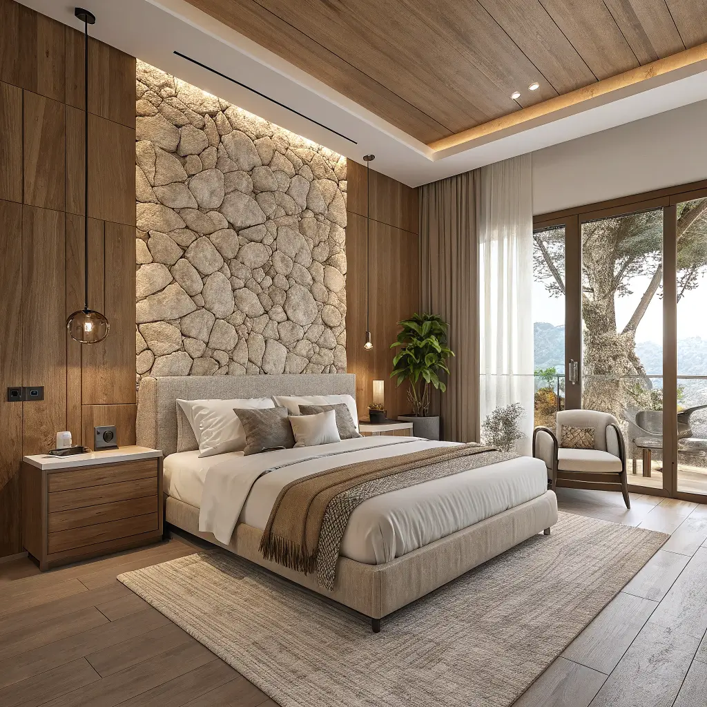 - Textured panels such as wood slats or 3D wall tiles