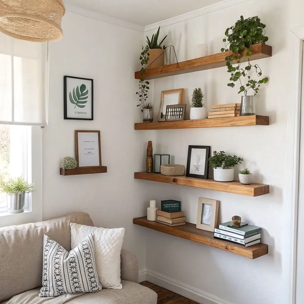 Floating shelves are like the Swiss Army knife of corner decor – versatile, practical, and somehow always look good. I installed my first set three years ago, and honestly, they’ve become my favorite spot to show off everything from vintage cameras to that fancy candle I’m too scared to actually burn.