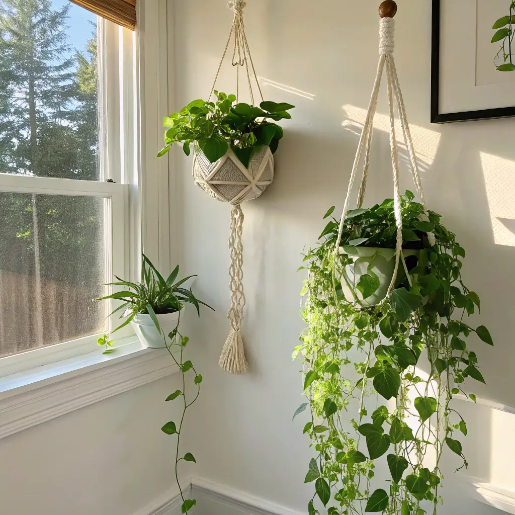 Macrame hangers are having their moment (again), but don’t sleep on modern geometric planters or minimalist rope designs. Mix materials like ceramic, woven baskets, and metal for visual interest. Pro tip: choose trailing plants like pothos, string of pearls, or spider plants – they create that dreamy waterfall effect.