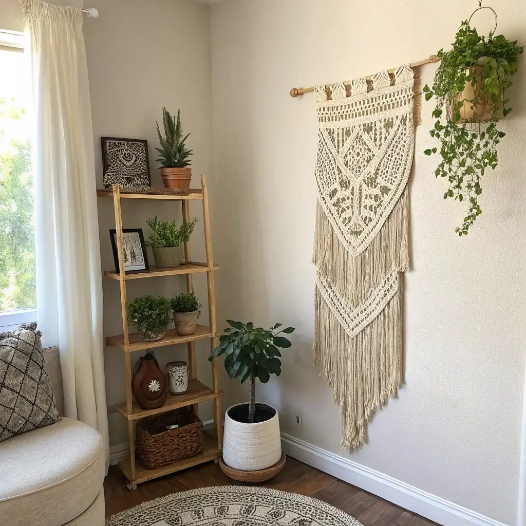 Macrame in corners adds texture and movement that flat art can’t achieve. That negative space everyone talks about? Macrame fills it without making it feel heavy or cluttered.