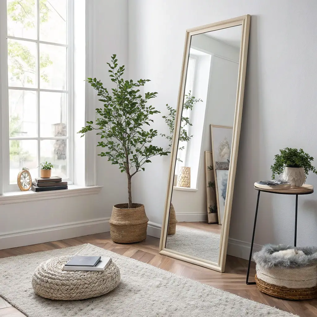 A well-placed corner mirror doesn’t just make your room look bigger – it transforms the entire energy of the space. Light bounces around, creating depth that wasn’t there before, and suddenly your 10×10 room feels like a loft.