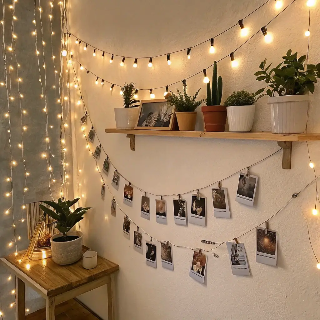 String lights with clips in corners create this warm, nostalgic vibe that makes any space feel personal. It’s like Pinterest and your childhood bedroom had a sophisticated baby.