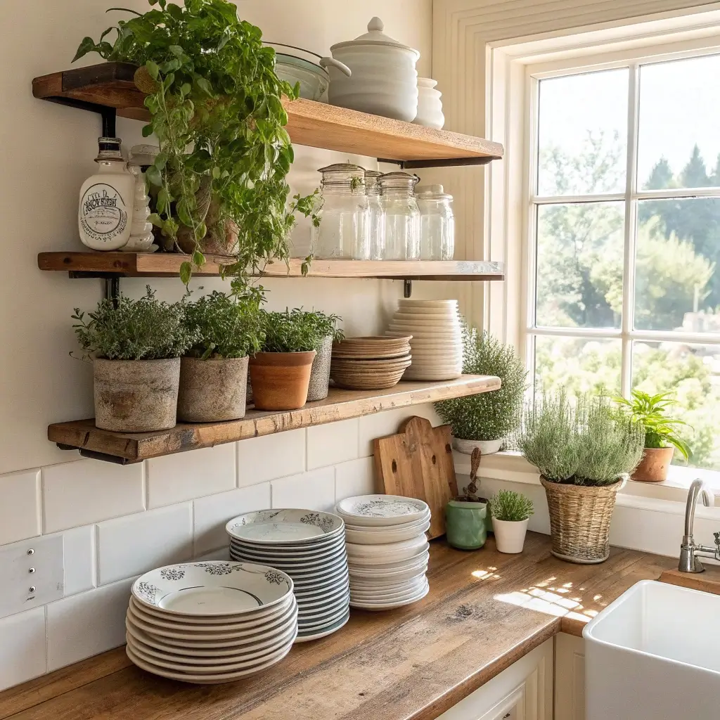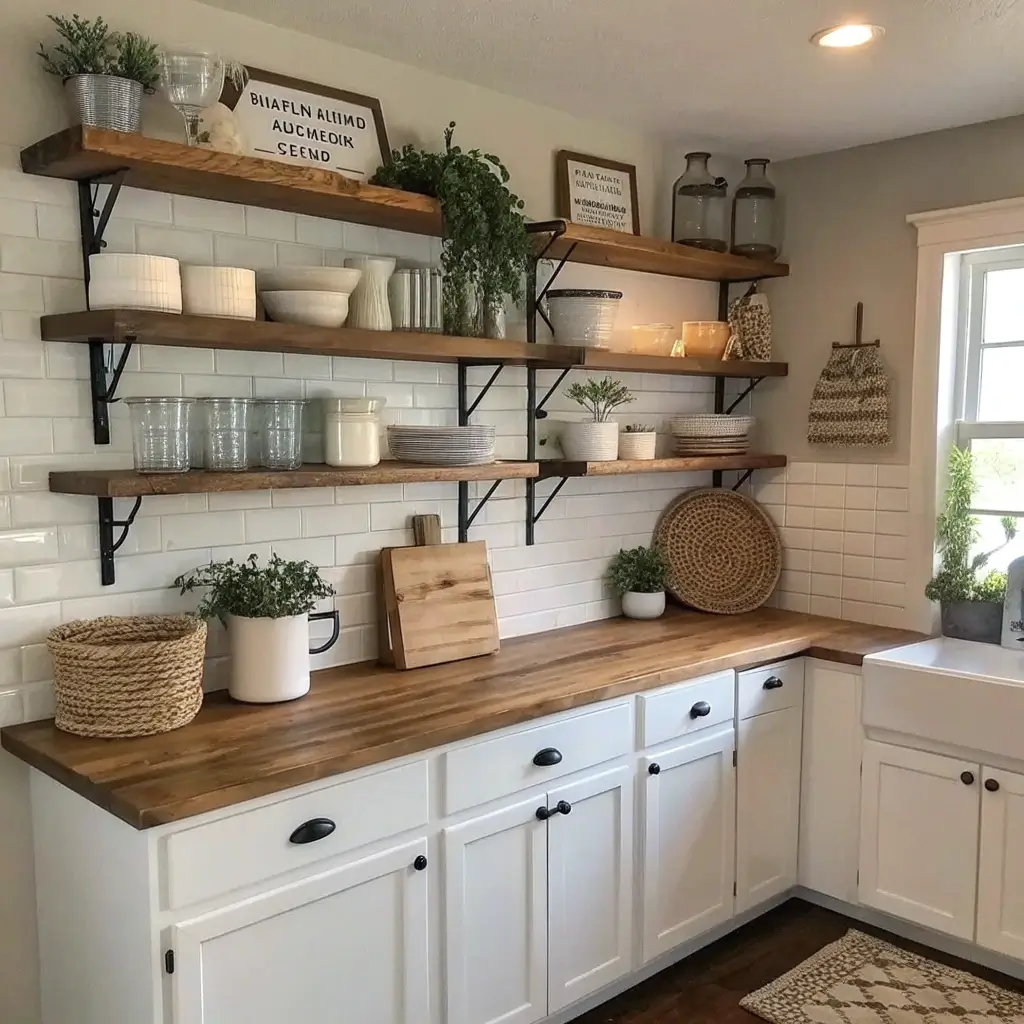 Want to know the best part about open shelving? It forces you to declutter and only keep what you love. That mismatched mug collection? Time to pare it down. Those plastic containers? Hide them in a closed cabinet. The result is a curated, intentional look that screams farmhouse chic.