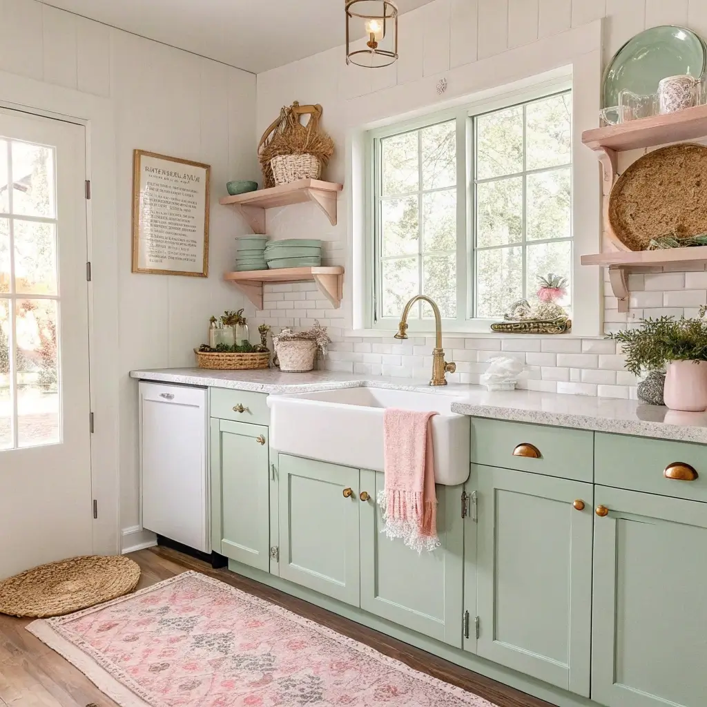 I painted my kitchen cabinets a color called “morning mist” (basically a gray-green sage), and I cannot overstate how much it transformed the space. The trick is balancing your pastels with plenty of warm wood tones and crisp white accents.