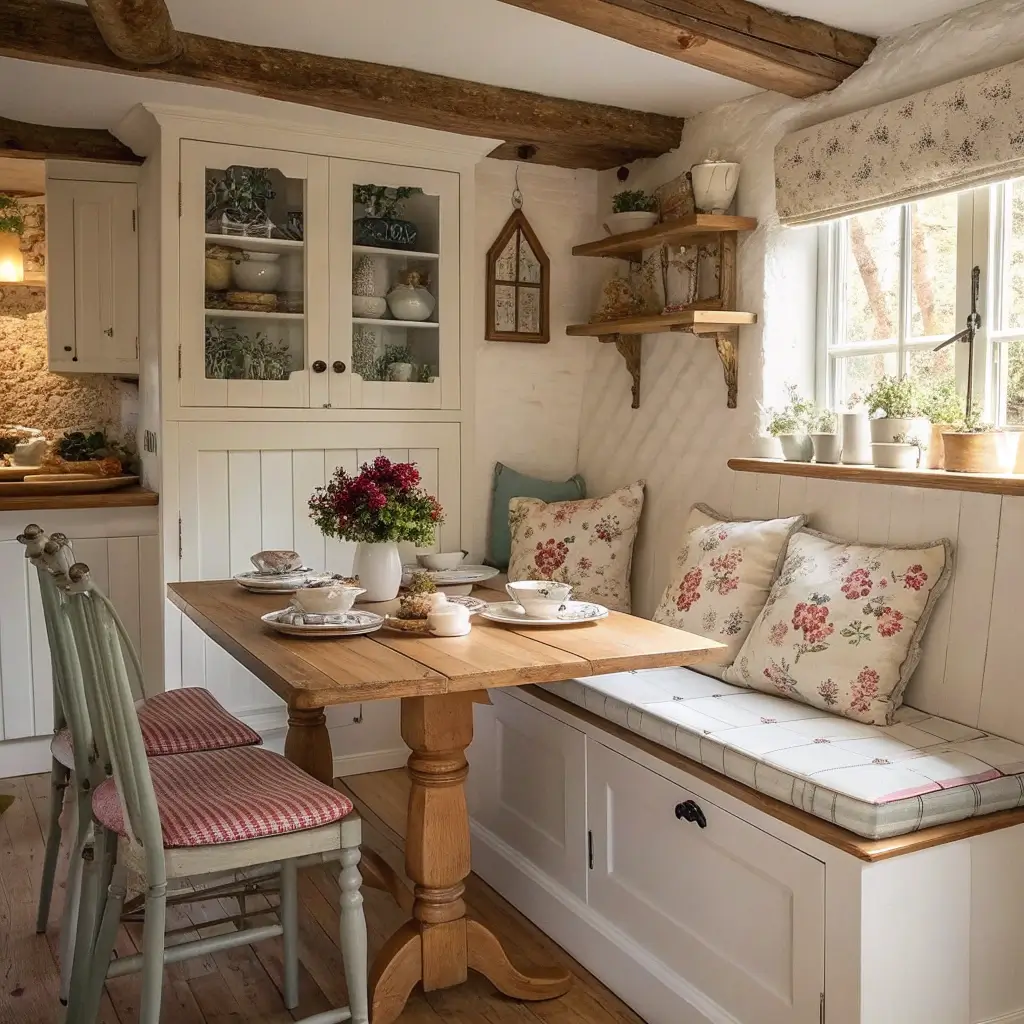Creating a cozy breakfast nook in your cottage kitchen doesn’t require a ton of space. Here’s what you need: