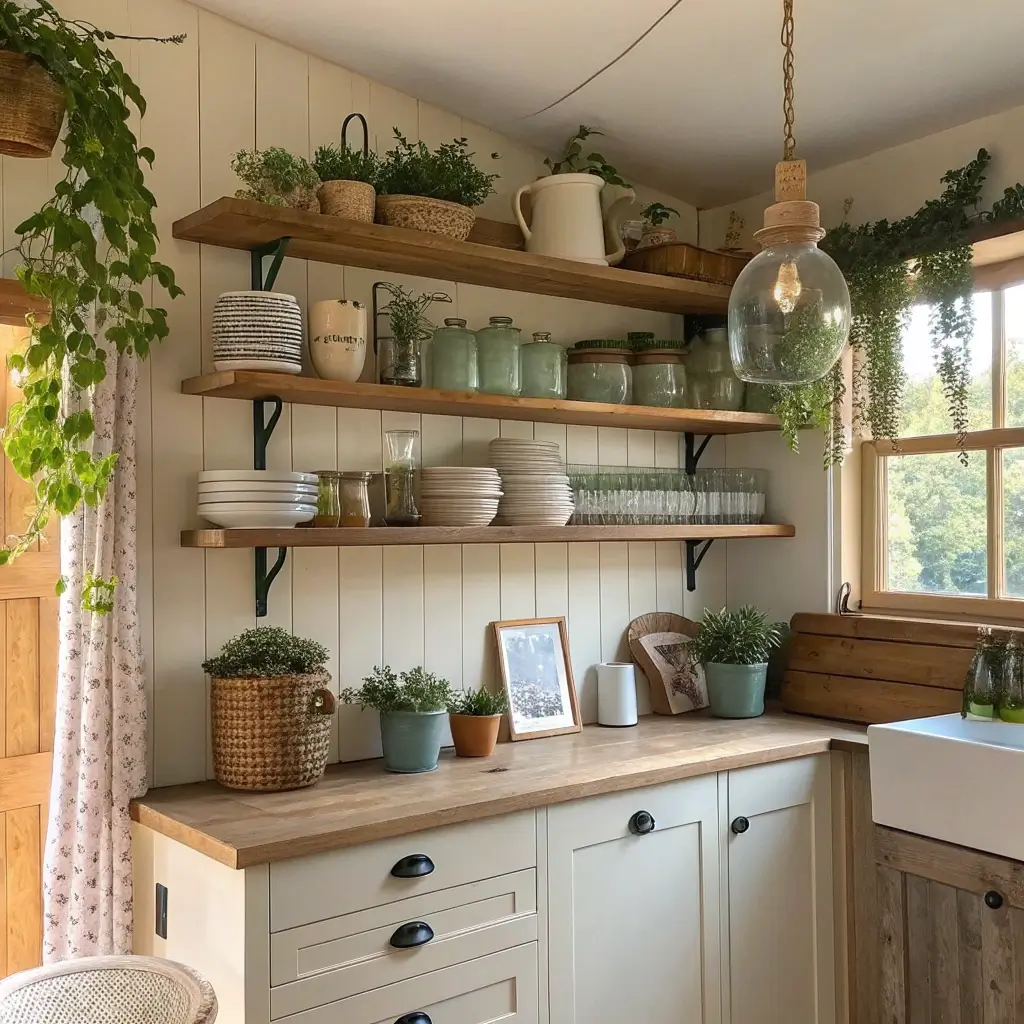 Rustic wooden shelving does more than just store your dishes—it creates visual warmth and invites that lived-in cottage aesthetic we’re all chasing. The key here is choosing wood with character. Think: