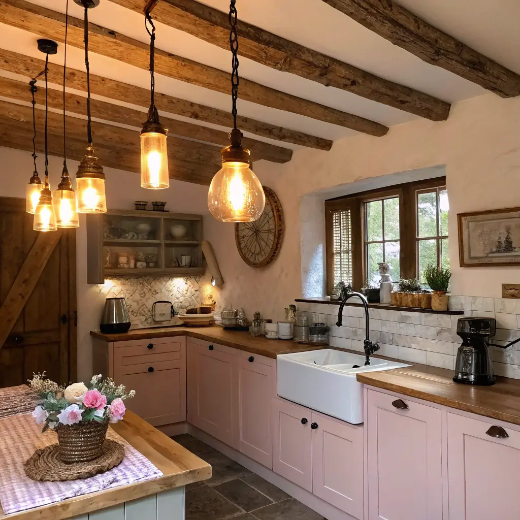 Cottage kitchens need layered, warm lighting that mimics natural daylight and candlelight. Here’s how to achieve it: