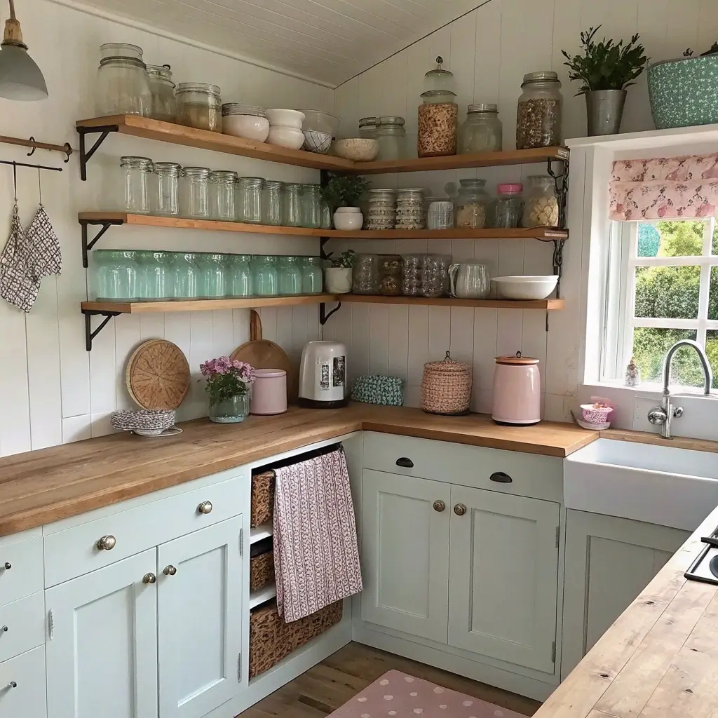 Pro tip: Mix your everyday dishes with a few decorative pieces. A vintage pitcher here, a potted herb there, and suddenly your shelving looks like it belongs in a home magazine. IMO, the perfectly imperfect arrangement is what makes cottage style so appealing.