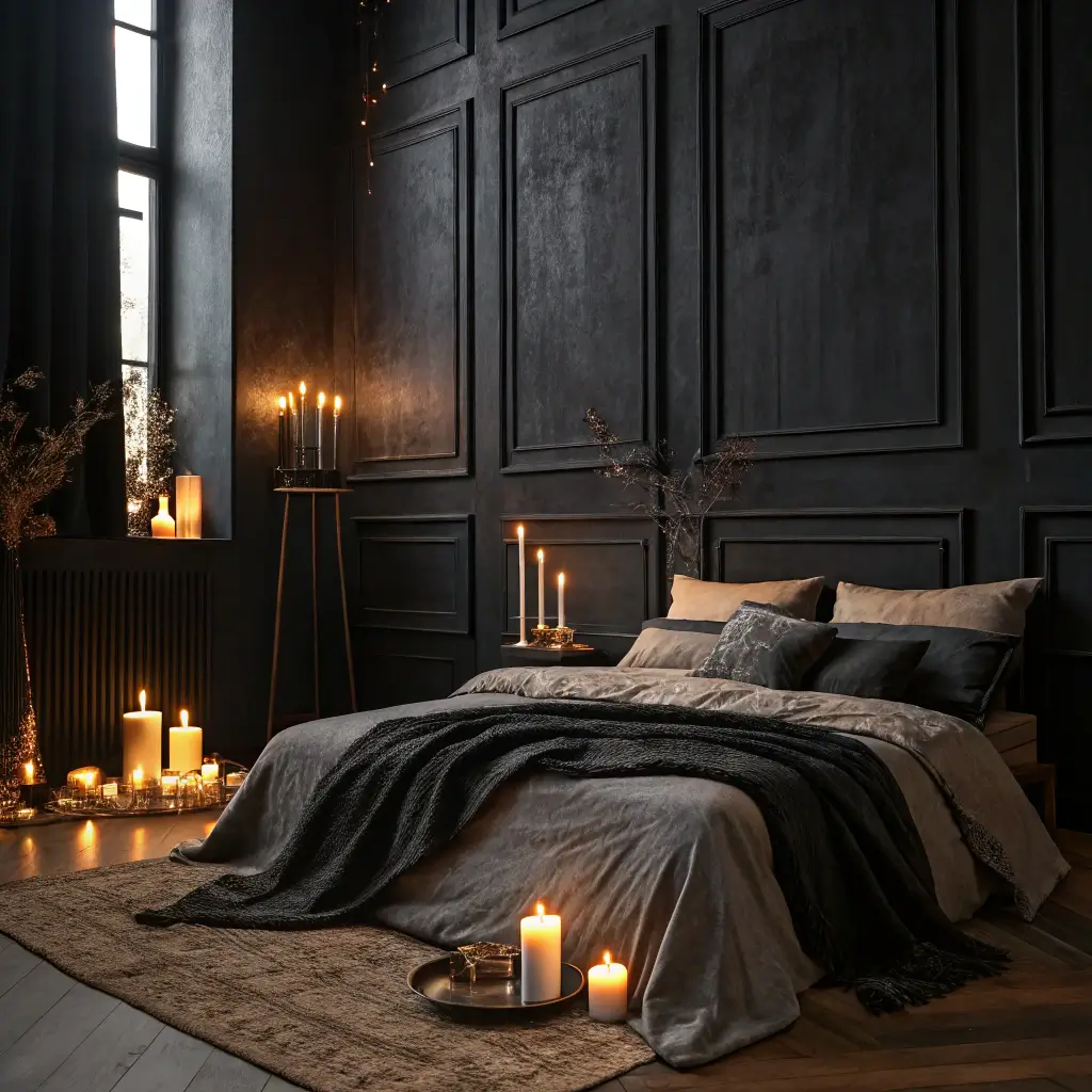 This one’s for my fellow comfort-seekers who want darkness without coldness. A warm shadow retreat combines deep warm tones with strategic shadowy corners to create a bedroom that feels like a permanent hug.
